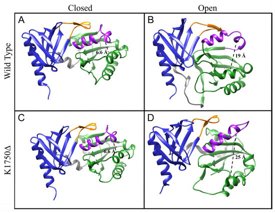 Comparison of the closed and open conformation for the Sec14 domain of neurofibromin. The distance between the α-carbons of S1639 and L1675 is shown with a dashed line. Those frames were chosen from trajectories at 400 K for wt (A,B) or K1750Δ (C,D) in which two conditions were satisfied: the maintenance of the secondary structure content, especially in the helices of the lipid pocket, and an S1639Cα–L1675Cα distance compatible with an open conformation (for B,D), using as a reference the 23 Å in the yeast Sec14p.