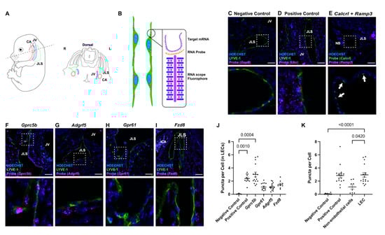 In situ localization of lymphatic endothelial cell-enriched GPCR expression. (A) Schematic diagram of E14.5 transverse section of mouse embryo depicting the sterotypic positioning of carotid artery (CA), jugular vein (JV) and jugular lymph sac (JLS). (B) Schematic diagram of RNAscope probe design, illustrating how a single mRNA molecule is amplified into a visible fluorophore puncta within a cell. (C–I) RNAscope images for indicated probes (magenta), Hoechst nulcei (blue) and the lymphatic maker LYVE-1 or Calcrl in panel (E) (green). Probe names are listed at top of images. Lower images are higher magnification views of the white dashed inset. White arrows in (E) point to lymphatic endothelial cells with double-labeling of the lymphatic GPCR, Calcrl (green) and Ramp3 (magenta). Scale bars = 50 µm. (J) RNAscope quantification for each orphan receptor probe in lymphatic endothelial cells and (K) RNAscope quantification for Gprc5b in various tissue types. Puncta per cell is a relative measure of the number of mRNA transcripts for the target gene. Non-endothelial cells (non-ECs) represent all background cells. LEC = lymphatic endothelial cells. Significance calculated using Kruskal–Wallis nonparametric analysis of variance with Dunn’s multiple comparisons test. p-values equal to or less than 0.05 are shown.