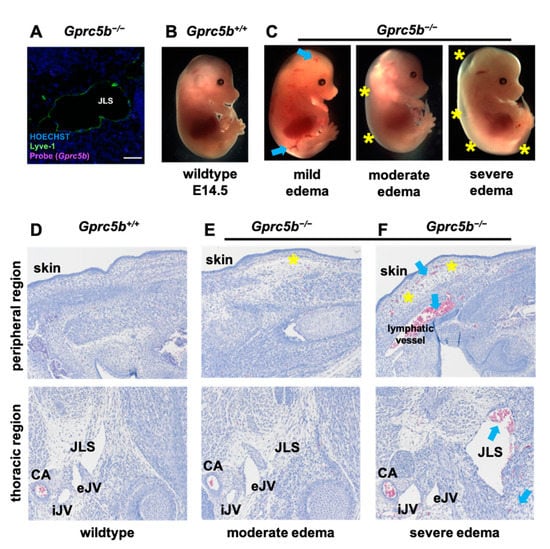 Lymphatic development is attenuated in murine Gprc5b−/− embryos. (A) RNAscope performed on jugular section of Gprc5b−/− embryo, confirming absence of mRNA expression (compare to Figure 1F): Gprc5b probe (magenta), LYVE-1 lymphatic marker (green), Hoechst cell nuclei (blue). (B) E14.5 Gprc5b+/+ littermate control embryo. (C) E14.5 Gprc5b−/− embryos show graded levels of edema (yellow asterisks) and hemorrhagic plaques (blue arrows). Compared to normal Gprc5b+/+ littermate controls (D), representative H&E images showing subcutaneous edema in the back skin (upper panels, yellow asterisks) and blood-filled lymphatic vessels (lower panels, blue arrows) in Gprc5b−/− embryos with moderate to severe edema (E,F). CA, carotid artery; iJV, internal jugular vein; eJV, external jugular vein, JLS, jugular lymph sac.