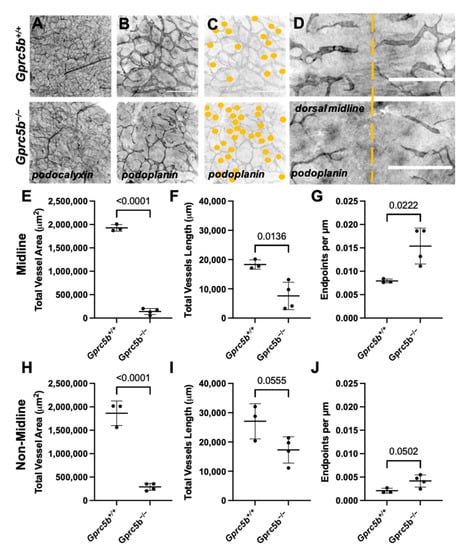 Histomorphometric analysis of vascular development reveals attenuated lymphangiogenesis in murine Gprc5b−/− embryos. Whole-mount immunostaining of dorsal skin from E14.5 Gprc5b+/+ (top panels (A–D)) and Gprc5b−/− (bottom panels (A–D)) embryos, stained for the blood vascular marker podocalyxin (A) and the lymphatic marker podoplanin (B–D). Yellow dashed line indicates the dorsal midline (D). Scale bars = 500 µm (E–J). Quantification of total vessel area, total vessel length and relative endpoint counts of lymphatic vessels present at the dorsal back skin midline (E–G) and in the dorsal backskin in non-midline locations (H–J). Significance calculated using unpaired Student’s t-tests.