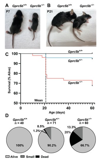 2.5. Some Gprc5b−/− Mice Exhibit Growth Restriction and Die Postnatally