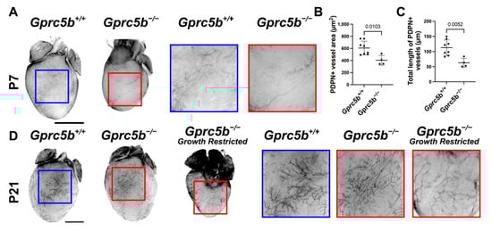 The growth and maturation of the lymphatic vascular system continues in many organ beds during the postnatal period. For example, cardiac lymphatics robustly grow and expand to cover the surface of the myocardium between postnatal day 1 and postnatal day 15 []. Interestingly, we found that cardiac lymphatic growth and surface area coverage, as visualized by podoplanin whole-mount immunostaining of the heart, was significantly attenuated on postnatal day 7 in growth-restricted Gprc5b−/− mice compared to Gprc5b+/+ controls (Figure 6A–C). By postnatal day 21, the Gprc5b−/− mice that did not suffer from growth restriction exhibited normal and robust cardiac lymphangiogenesis (Figure 6D). However, cardiac lymphangiogenesis was persistently attenuated in the growth-restricted Gprc5b−/− animals (Figure 6D), despite their equivalent heart weight:body weight ratios (Gprc5b+/+ = 5.467 mg/g +/− 0.15 SEM; Gprc5b−/− = 5.53 mg/g +/− 0.12 SEM; n = 3/group, p = 0.8). Together, these data indicate that expression of Gprc5b during the postnatal period is important during the development of normal organ-specific lymphangiogenesis in mammal hearts.