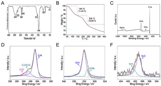Analyses of the structure and composition of Ala-C60. (A) FTIR spectrum. (B) TGA curve. (C) XPS survey. (D–F) High-resolution XPS spectra of C1s, O1s, and N1s.