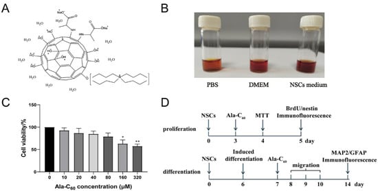 (A) Proposed structure of Ala-C60. (B) Photos of Ala-C60 dissolved in PBS (1 mg⋅mL−1), DMEM (1 mg⋅mL−1), and NSCs medium (1 mg⋅mL−1). (C) Cell viability of NSCs treated with Ala-C60. (D) Experimental scheme of Ala-C60 on NSCs. Values represent the mean ± SEM, * p < 0.05 and ** p < 0.01 indicate statistical significance between Ala-C60 treatment group and Ala-C60 0 μM group. All statistical according to ANOVA followed by LSD post hoc analysis.