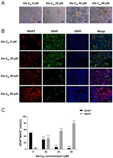 Next, the NSCs as neurosphere suspension culture was induced to differentiate by the differentiation medium on the sixth day after plating. Neurospheres and differentiation medium were added to the 24-well plate after treatment with poly-L-lysine. Ala-C60 was added into the medium after plating for 24 h. Interestingly, after one week of differentiation, the cells showed a spider web-like morphology compared to those in the control group (Figure 4A). On the seventh day after being treated with Ala-C60, double immunofluorescence staining was performed. Microtubule association protein-2 (MAP2), an important component of the cytoskeleton of neurons, is also a specific marker of mature neurons []. Meanwhile, glial fibrillary acidic protein (GFAP) is a marker of astrocytes []. As shown in Figure 4B,C, with the dose increase of Ala-C60, the proportion of MAP2-positive cells in the total number significantly increased, compared with the control group (5.32 ± 1.55%). The percentages of MAP2-positve cells treated with 20, 40, and 80 μM Ala-C60 were 33.10 ± 5.18%, 56.30 ± 2.73%, and 79.39 ± 3.90%, respectively. Contrary to the increasing trend of MAP2-positive cells, the percentage of GFAP-positive cells was significantly reduced in the group treated with Ala-C60. The percentages of GFAP-positive cells treated with 20, 40, and 80 μM Ala-C60 were 29.75 ± 6.22%, 6.97 ± 0.61%, and 3.65 ± 1.00%, compared to the control group (50.63 ± 4.89%, Figure 4C). These results indicated that Ala-C60 promoted neuronal differentiation while inhibiting glial differentiation.