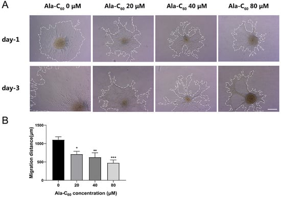 To explore whether Ala-C60 affected the migration of NSCs, the migration distance between NSCs progeny and neurospheres was measured during differentiation. After being treated with Ala-C60 for 24 and 72 h, we measured the longest diameters of migrating differentiated cells to the neurospheres’ core in each group. The migration distance was 1104.39 ± 278.58 μm in the control group, while the migration distances in groups treated with different concentrations of Ala-C60 were 711.36 ± 236.80 μm, 628.39 ± 321.08 μm, and 475.56 ± 193.04 μm, respectively (Figure 5A,B). The groups treated with Ala-C60 had a significantly shorter migration distances compared to the control group. These data indicate that Ala-C60 inhibited the migration of NSCs progeny. Moreover, the migration was inhibited more severely at a higher concentration of Ala-C60.