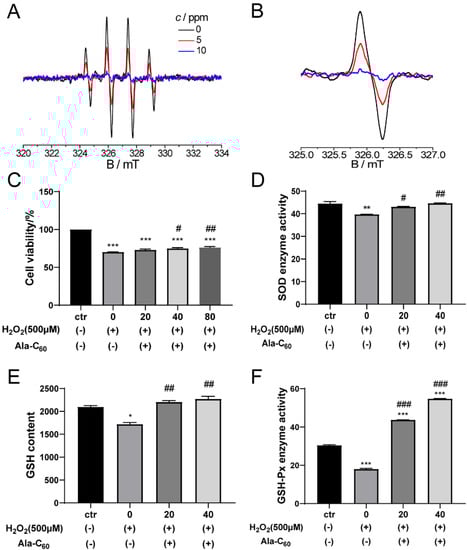 H2O2 is the classical reagent to study oxidative stress. First, the capability of Ala-C60 to scavenge the hydroxyl radical (OH·) produced by H2O2 was investigated by electron spin resonance (ESR) measurements. As shown in Figure 6A,B, the intensity of the peak decreased continuously with the increasing concentration of the Ala-C60. The initial quenching of OH− is pretty fast, with a quenching efficiency of up to 49.8% at a concentration as low as 4 μg·mL−1 (∼5 ppm). It then slows down at relatively large concentrations of the Ala-C60, which reaches ∼89% at 8.6 μg·mL−1.