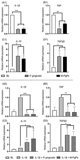 As the first line of defense in the periodontium, gingival epithelial cells play essential roles in maintaining periodontal homeostasis and health. Thus, numerous studies have investigated the immuno-inflammatory responses in HGECs challenged by pathogenic bacteria such as P. gingivalis [34,35,36]. Our group has recently demonstrated, for the first time, that M-PgPs perturb the innate immune responses in HGECs [19] in an identical fashion to P. gingivalis. Similar results were found in the present study, showing that the pro-inflammatory cytokine genes (IL-1β and TNF) were downregulated, while the anti-inflammatory cytokine genes (IL-10 and TGF-β2) were upregulated by M-PgPs, with reference to the untreated group. However, the underlying mechanisms involved in the M-PgP-induced disruption of innate host defense and the relevant biological implications remain unclear.