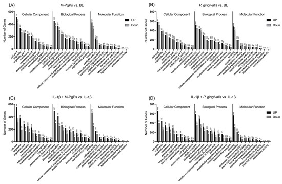 Gene Ontology functional annotation of DEGs in different comparison groups. The top 10 terms of GO functional annotation assigned from the DEGs in different comparison groups are shown. M-PgPs vs. BL (A); P. gingivalis vs. BL (B); IL-1β + M-PgPs vs. IL-1β (C); and IL-1β + P. gingivalis vs. IL-1β (D). GO terms are shown on the x axis. Numbers of DEGs enriched in the terms are shown above the bar. Black bar: upregulated genes. Gray bar: downregulated genes. Samples for RNA-Seq were obtained from three independent experiments.