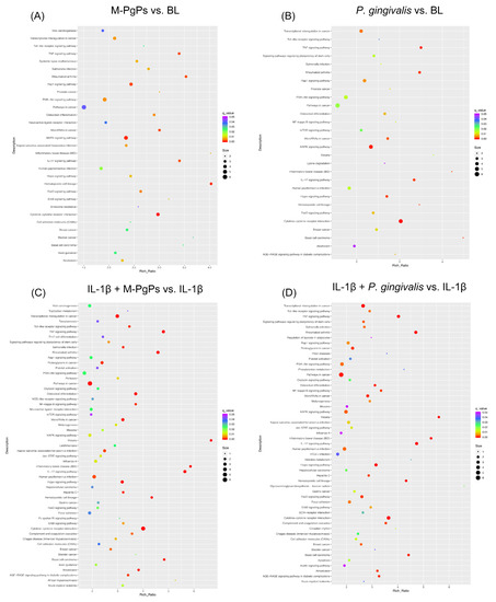 KEGG pathway enrichment analysis of DEGs in different comparison groups. M-PgPs vs. BL (A); P. gingivalis vs. BL (B); IL-1β + M-PgPs vs. IL-1β (C); and IL-1β + P. gingivalis vs. IL-1β (D). Rich Ratio is shown on the x axis. KEGG pathway names are shown on the y axis. Size of the dots represents numbers of genes enriched in the term. Color of the dots represents q value. Samples for RNA-Seq were obtained from three independent experiments.