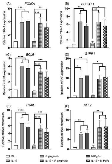 FOXO signaling pathway in HGECs was upregulated by M-PgPs. Relative mRNA expression levels of FOXO1 (A), BCL2L11 (B), BCL6 (C), S1PR1 (D), TRAIL (E) and KLF2 (F) in HGECs after the treatment of M-PgPs (1:100) for 24 h were analyzed using RT-qPCR. HGECs without any treatment served as blank control (BL). HGECs treated with P. gingivalis (1:100, 24 h) served as positive control. IL-1β (1 ng mL−1) was added 6 h before M-PgPs and P. gingivalis treatment. * p < 0.05; ** p < 0.01; *** p < 0.001; **** p < 0.0001. Data represent the mean ± SD of three independent experiments.