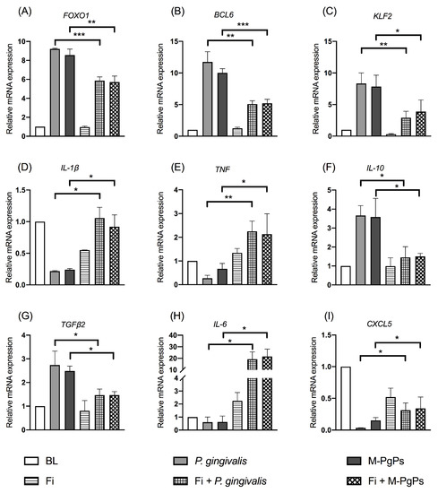FOXO1 inhibitor (Fi) rescued the inhibitory effects of M-PgPs on the immuno-inflammatory response of HGECs under normal condition. Relative mRNA expression levels of FOXO1 (A), BCL6 (B), KLF2 (C), IL-1β (D), TNF (E), IL-10 (F), TGF-β2 (G), IL-6 (H) and CXCL5 (I) in HGECs after the treatment of M-PgPs (1:100) for 24 h were analyzed using RT-qPCR. HGECs without any treatment served as blank control (BL). HGECs treated with P. gingivalis (1:100, 24 h) served as positive control. Fi (1 μM) was added 2 h before M-PgPs and P. gingivalis treatment. * p < 0.05; ** p < 0.01; *** p < 0.001. Data represent the mean ± SD of three independent experiments.