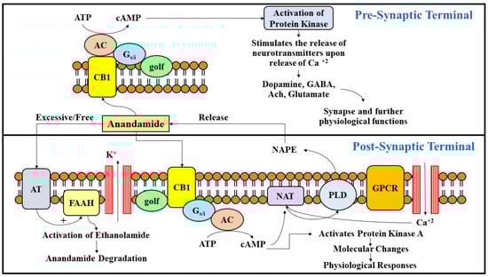 The figure presents a general overview on the synthesis, release, uptake, and degradation of endocannabinoid Anandamide. NAPE is a precursor of lipid, which is the source of release of anandamide upon activation of phospholipase D and further stimulation of GPCR. NAT is a catalytic enzyme which hastens the biosynthesis of NAPE upon release of cAMP and calcium ions. Upon activation of cannabinoid receptors at presynaptic sites, they are released into synapse and further initiate the release of several neurotransmitters which control and modulate various physiological functions in the body. The excitation of neurons is also regulated upon nodulation of the potassium channel, and regulates the release of protein kinases. The action of anandamide is terminated by its cellular uptake via anandamide transporter or its degradation upon activity of FAAH enzyme.