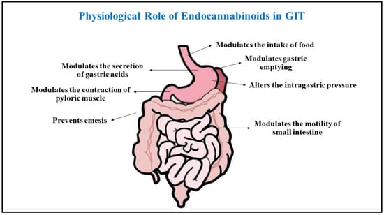 The endocannabinoid system has also been found through various studies to modulate the intake of food through activity of cannabinoid receptors located in the brain and in peripheral tissues. The CB1 receptors, upon selectively interacting with the capsaicin sensitive sensory terminals, can modulate the intake of food and thereby present an unexpected role of endocannabinoids in control and monitoring of diet, and can regulate feeding [,]. The endocannabinoids are being explored for their pathophysiology in the gastrointestinal tract, and are being characterized as therapeutic treatment in curing several gastrointestinal tract (GIT)-associated ailments. With an increase of resources and technology, the evident role of cannabinoid is being exposed in the treatment of a variety of gastrointestinal dysfunction in humans. Several patient reports and anecdotal data have outlined the role of endocannabinoid extracts in the management of abdominal cramps and diarrhea [,].
