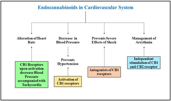 The cannabinoid receptors have been found to be widely distributed throughout the cardiovascular system. The CB1 receptors are present in the coronary artery, endothelial cells, myocardial cells, and smooth muscle cells besides the sympathetic nerve terminals present on presynaptic site which intervene with the cardiovascular system []. The presence of CB2 receptors has also been detected in the human coronary endothelial cells, myocardial cells, and smooth muscle cells of the heart. Endocannabinoids are synthesized in the smooth muscle and endothelial cells of the cardiac tissue, and can be detected in the circulating blood, and thereby play a significant role in regulation and management of the functioning of the cardiovascular system. The animal models who possess knocked out FAAH enzyme fail to show any major changes in the functioning of the cardiovascular system, implicating an evident role of cannabinoid molecules and their receptors in cardiovascular physiology. Mice which have a knocked out FAAH enzyme showed a diminished decline in age-mediated functioning of the cardiac system, thereby making the animals susceptible to atherosclerotic diseases. Studies with mice having knocked out CB1 receptors have shown them to be more vulnerable to conditions like stroke and chronic heart failure, and deficiency of cannabinoid receptors have been detected to be more amenable towards atherosclerosis and cardiomyopathy, indicating a crucial role of the endocannabinoid system in maintaining healthy functioning of the cardiovascular system [,].