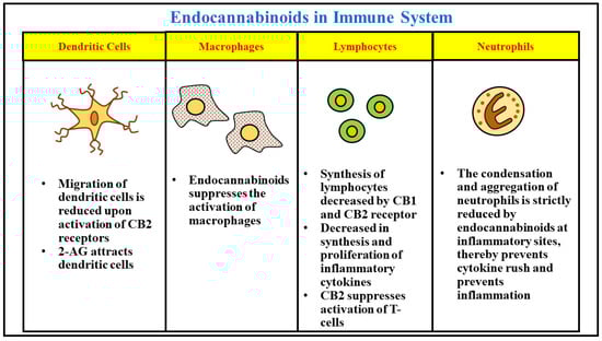 The endocannabinoids also play a significant role in controlling the functioning of the immune system and help to maintain immune homeostasis. The immune cells express both the types of endocannabinoid receptors CB1 and CB2, and lead to further secretion and transportation of these molecules and regulate the breakdown mechanisms. The receptors of endocannabinoid are highly expressed in immune B cells, followed by monocytes, natural killer cells, neutrophils polymorphonucleated, CD4 and CD8 lymphocytes. The CB1 receptors facilitate neurobehavioral effects due to their dense expression in the central nervous system []. The CB2 receptors are over 10–100 times more manifested in the immune cells compared to the CB1 receptors, indicating the role of numerous endocannabinoid compounds in the regulation of immune responses []. The concentration of 2-AG endocannabinoids was found to be higher in the plasma of blood compared to plasma of the bone marrow cells. A proven role of CB2 receptors has been found in retaining the immature B cells of the bone marrow and are also involved in inhibiting the recovery of lymphocytes post transplantation of bone marrow []. CB2 receptors present on neutrophils mediate the anti-inflammatory actions of released endocannabinoids from the P-glycoprotein. A deficiency of CB2 receptors led to acute exacerbation of the mobilization of neutrophils to the inflammation sites. The CB1 and CB2 receptors also mediate the regulation of other associated innate immune cells, such as macrophages, monocytes, and microglial cells, where they engage in augmenting immunosuppressive activity. The activity of macrophages associated with tumors is also believed to be inhibited by CB2 receptors. The migration of signaling through dendritic cells is also believed to be suppressed under the presence of CB2 receptors by inhibiting the expression of matrix metalloproteinase 9. Apart from their role in regulating the immune cells, the endocannabinoid system also regulates adaptive immunity of an individual. The expression of CB2 receptors in T cells in comparison to immune cells is seen to a lesser extent; however, upon stimulation, T cells can up-regulate the manifestation of CB2 receptors and can also cause the expression of CB1 receptors. The elementary cytokine implicated in the activity and differentiation of T cells is interleukin 2, which is secreted upon the activation of natural killer cells and T-cells. The synthesis of interleukin 2 is condensed upon activation of both CB1 and CB2 receptors. Anandamide presented a significant role in functioning of mature B cells and induced a dose-dependent immunosuppression. In addition, activation of 2-AG by T-cells and B-cells successfully modulated inflammation, and immunity induced by vaccination was also reduced upon legation of CB2 receptors. Hence, altogether the endocannabinoid system can be considered to play a significant part in modulation as well as functioning of the immunological system. Inflammation, moderate in intensity, plays a protective role against several infectious diseases and provides long term adaptive immunity towards selective microorganisms []. Nevertheless, uncontrolled or chronic inflammation rising due to a hypersensitive immune system can result in incessant tissue damage. Patients suffering with autoimmune diseases take medications to benefit from their activated immune system and trim down inflammation. Conversely, patients with poor immunity, such as those suffering from cancer, aim to uplift their immune system to prevent tumors. Hence, endocannabinoid-based treatments can be effective in the management of several immune-related diseases (Figure 4).