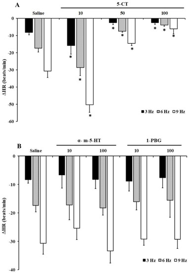 - García-Pedraza, J.Á.; García, M.; Martín, M.L.; Eleno, N.; Morán, A. Chronic Sarpogrelate Treatment Reveals 5-HT7 Receptor in the Serotonergic Inhibition of the Rat Vagal Bradycardia. J. Cardiovasc. Pharmacol. 2017, 69, 13–22. [Google Scholar] [CrossRef] [PubMed]