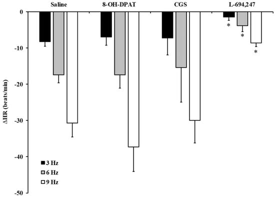 Effect of 5-HT1 receptor subtypes on the vagally-induced bradycardic responses in fluoxetine-treated diabetic rats. Effect of i.v. bolus injections of saline (1 mL/kg), 8-OH-DPAT, CGS-12066B (CGS) and L-694,247 (50 μg/kg each agonist; n = 5 for each treatment) on the decreases in heart rate (ΔHR) evoked by electrical vagal stimulation (3, 6 and 9 Hz) in fluoxetine-treated diabetic pithed rats. * p < 0.05 versus saline.