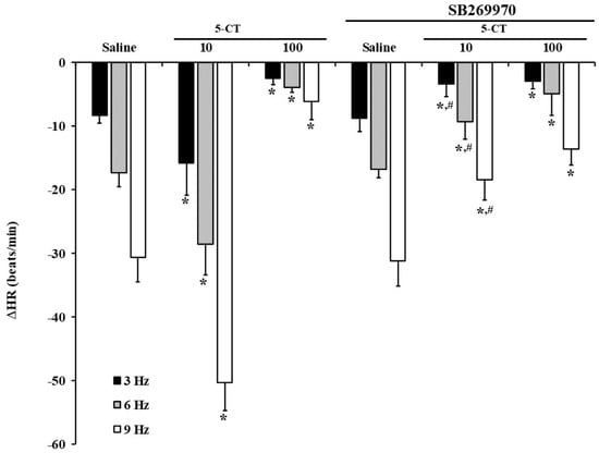 Effect of i.v. bolus of SB269970 in the saline- or 5-CT-influence on the electrically-induced bradycardic responses in fluoxetine-treated diabetic rats. Changes in decreases in heart rate (ΔHR) by electrical vagal stimulation after i.v. administration of bolus of saline (1 mL/kg) or 5-CT (10 and 100 μg/kg) in the presence or absence of SB269970 (0.5 mg/kg. i.v.) in fluoxetine-treated diabetic pithed rats. * p < 0.05 versus respective saline. # p < 0.05 versus 5-CT 10 μg/kg.