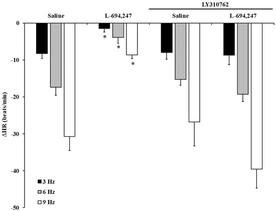 Effect of L-694,247 in the presence of 5-HT1D receptor antagonism on the electrically-induced decreases in heart rate in fluoxetine-treated diabetic rats. Effect of i.v. bolus injections of LY310762 (1 mg/kg) in the inhibitory effect of L-694,247 (50 μg/kg) on the decreases in heart rate (ΔHR) evoked by electrical vagal stimulation (3, 6 and 9 Hz) in fluoxetine-treated diabetic pithed rats. * p < 0.05 versus saline.