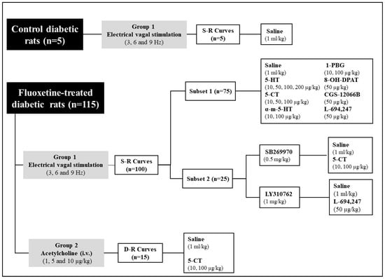 After 28 days of diabetes induction, animals were anaesthetised (sodium pentobarbital, 60 mg/kg, i.p.) and pithed [,]. Jugular veins were catheterised for drug administration. MBP and HR were monitored through the left carotid artery, using the software Labchart Scope through a PRS 206 amplifier (Cibertec, Madrid, Spain) and a Power Lab System (AD Instruments, Oxford, United Kingdom). Vagus nerves were isolated and set for electrical vagal stimulation [,,,]. Animals were then pre-treated intravenously with heparin (1000 UI/kg;) and atenolol (1 mg/kg) [,]. Then, FT diabetic animals were split into 2 groups, (Figure 5) in order to analyse the role of several serotonergic agents on the bradycardic responses evoked by electrical vagal stimulation (group 1; n = 105) or by intravenous bolus injections of exogenous ACh in FT diabetic rats (group 2; n = 15).