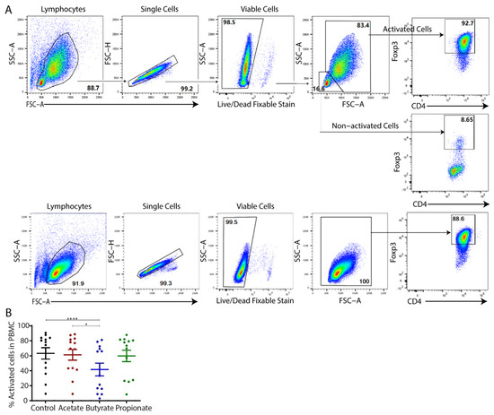 Short-chain fatty acids (SCFAs), the major end products of bacterial fermentation in the human colon, play an important role in protection against several chronic inflammatory or autoimmune diseases, such as asthma, allergies, inflammatory bowel disease, and type 1 diabetes, mostly through their putatively significant role in Treg induction [1,18,19,20,21,22,23]. Indeed, the substantial contribution of SCFAs to the differentiation of mouse Tregs extrathymically both in vivo or in vitro, so-called induced Tregs (iTregs), has been shown [24,25,26,27]. Data on the effects of SCFAs on human Tregs are sparse and the successful in vitro development of fully functional human iTregs using a SCFAs-augmented protocol has not been reported yet [18,26,27,28,29].