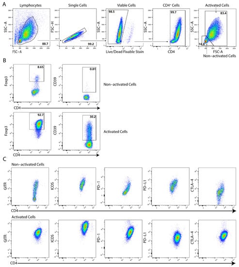 Flow cytometric analyses using BD FACSVerse (8-channel, Becton Dickinson) were conducted for all of the cultured cells, and a LIVE/DEAD™ Fixable Aqua Dead Cell Stain Kit (V500, L34966, Thermo Fisher Scientific) was used to determine the viability of all of the cultured cells prior to the fixation and permeabilization required for intracellular antibody staining. Surface and intracellular staining was performed according to the manufacturer’s instructions. For the intracellular staining of Foxp3 and CTLA-4, a True-Nuclear™ Transcription Factor Buffer Set (424401, BioLegend) was used. The antibodies used included CD4 (PerCP-Vio700, 130-093-504, Miltenyi Biotec), CD39 (APC, 130-109-455, Miltenyi Biotec), Foxp3 (Alexa Fluor 488, 320212, BioLegend), GITR (PE, 130-092-895, Miltenyi Biotec), ICOS (VioBlue, 130-100-737, Miltenyi Biotec), PD-1 (APC/Cy7, 329922, BioLegend), PD-L1 (PE/Cy7, 329718, BioLegend), and CTLA-4 (APC, 349908, BioLegend). The gating strategy is shown in (Figure 2).