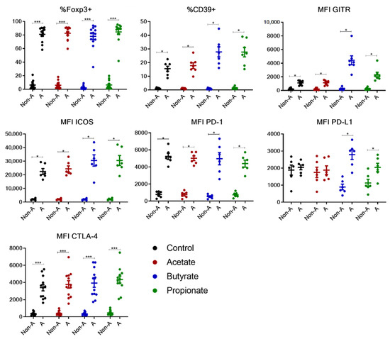 Enhanced expression of phenotypic markers in activated cells generated from adult naïve CD4+ cells. Scattered dot plot with mean + SEM showing the percentage of Foxp3+ and CD39+ cells, and mean fluorescence intensity (MFI) of GITR, ICOS, PD-1, PD-L1, and CTLA-4 gated on non-activated (Non-A) and activated (A) cells generated from adult naïve CD4+ cells under various conditions. All cells were cultured in the presence of transforming growth factor β and interleukin-2, and additionally with control, acetate, butyrate, or propionate. Data summarize thirteen independent experiments. Wilcoxon matched-pairs rank test was used for statistical analysis. * p < 0.05, *** p < 0.001.