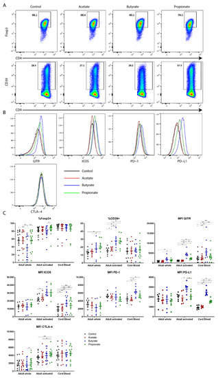Short-chain fatty acids (SCFAs) potentiate the generation of human transforming growth factor β (TGF-β)-induced Tregs in vitro. (A) Representative dot plots gated on live CD4+CD3+ T cells showing the percentage of Foxp3+ (upper panel) and CD39+ (lower panel) cells induced after culturing under various conditions: control (interleukin-2 (IL-2) + TGF-β), acetate (IL-2 + TGF-β + acetate), butyrate (IL-2 + TGF-β + butyrate), and propionate (IL-2 + TGF-β + propionate). (B) GITR, ICOS, PD-1, PD-L1, and CTLA-4 expression of live CD4+CD3+ T cells cultured under various conditions (see the legend to Panel A), as shown by representative histograms. (C) Scattered dot plots showing the mean and standard error of the mean (SEM) summarizing thirteen independent experiments for adults and twelve independent experiments for cord blood. Friedman test with Dunn’s multiple comparisons (post hoc) was used for statistical analysis. * p < 0.05, ** p < 0.01.