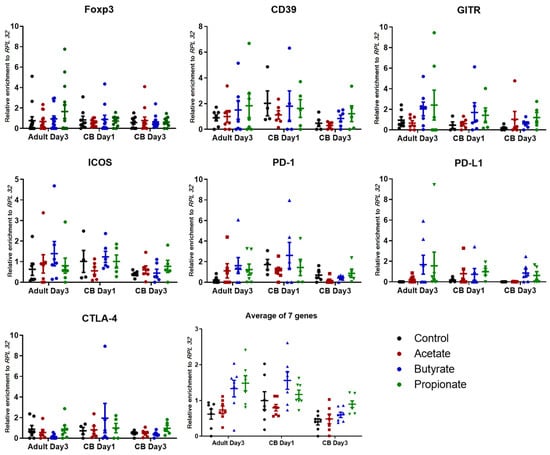 Histone H4 pan-acetylation status at the transcription-controlling regions of regulatory T cell (Treg) genes. Histone 4 acetylation levels at seven Treg loci given as the relative enrichment to ribosomal protein L32 (RPL32) in human adult (n = 7; peripheral blood) or newborn (n = 6; cord blood, CB) naïve CD4+ non-Treg cells differentiated toward iTreg phenotype in the presence or absence of short-chain fatty acids (SCFAs). Adult-derived cells were harvested on day 3, and CB-originating cells on days 1 and 3 (see Supplementary Figure S1). H4 acetylation was analyzed by a chromatin immunoprecipitation–quantitative polymerase chain reaction (ChIP-qPCR) assay. The data are expressed as means with the standard error of the mean (SEM). There was no statistical significance using the Friedman test with Dunn’s multiple comparisons (post hoc).