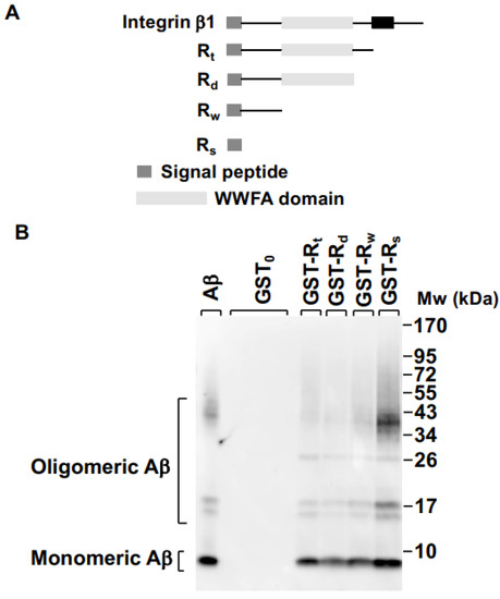 First, we analyzed the amino acid sequence of integrin β1 and selected four regions from its extracellular domain. The first region was constituted by the first 20 amino acids (aa) and it was identified as Rs, the second one, Rw, included up to aa 139, the third region covered aa 1 to 378 including the VWA domain (Rd), and the last region included the whole extracellular domain (from aa 1 to 728, Rt) (Figure 1A). Now, to determine what amino acid stretch could represent an effective binding domain for Aβ oligomers, four recombinant GST fusion proteins were generated (Rs, Rd, Rw, and Rt, fused to the GST protein), and their binding capacities to Aβ oligomers were determined by affinity chromatography as described in the Experimental procedures section. As shown in Figure 1B, the four fused proteins bound not only to the monomeric Aβ peptide (the most intense band) but also to the oligomeric forms, the strongest interaction being between the oligomeric forms with the GST-Rs recombinant fusion protein (Figure 1B, lane 7). On the other hand, in order to verify that GST protein (GST0) was not involved in the interaction between Aβ and the fused proteins GST-Rs, GST-Rd, GST-Rw, and GST-Rt, we examined this possibility by affinity chromatography. As shown in Figure 1B (lane 2), GST0 had no ability to bind either monomeric or oligomeric Aβ. Figure 1B (lane 1) represents the reconstitution of synthetic Aβ (as an internal control) in its different forms visualized by Western blotting. Together, these findings identified that the signal peptide (Rs) of the extracellular domain of integrin β1 was responsible for binding to Aβ oligomers in vitro.