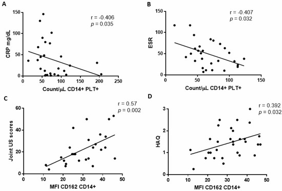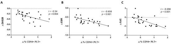 We also analysed the association between changes in the percentage of CD14+PLT+, mCD162 expression on monocytes and sCD62P at four weeks with changes in clinical and laboratory parameters at four weeks. We found that changes in CD14+PLT+ correlated inversely with changes in DAS28, ESR, and with swollen joint count (SJC) (Figure 4A,C). We did not find any association between changes in mCD162 expression on monocytes or plasmatic sCD62P levels and changes in clinical and laboratory parameters (data not shown).