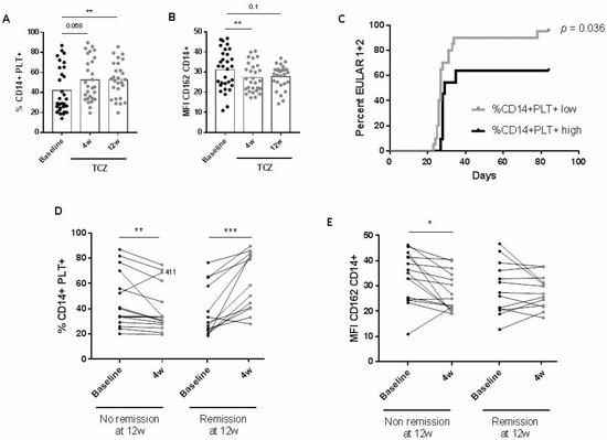 Changes in monocytes with bound platelets and CD162 expression after tocilizumab treatment and association with clinical response in rheumatoid arthritis (RA) patients. (A) Percentage of monocytes with bound platelets (CD14+PLT+) and (B) CD162 expression on monocytes before (Baseline) and four weeks (4 w) and twelve weeks (12 w) after tocilizumab (TCZ) treatment. (C) Kaplan-Meier curve for EULAR response. Percentage of patients with low or high %CD14+PLT+ achieving 1 (moderate) or 2 (good) EULAR response (days). (D) Changes in the percentage of CD14+PLT+ and (E) CD162 expression after 4 w of TCZ treatment in rheumatoid arthritis patients with no remission or remission at 12 w (left). Black circles represent RA patients before TCZ treatment, and grey circles RA patients after TCZ treatment. Statistical analysis was performed using Wilcoxon test for comparisons between baseline and 4 w or 12 w after TCZ treatment and log-rank Mantel–Cox test for the analysis of EULAR response during follow-up. * p < 0.05, ** p < 0.01, *** p < 0.001.