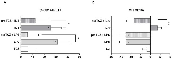 Heparinized blood was diluted with RPMI 1640 medium (supplemented with 2 mM glutamine, 100 U/mL penicillin, and 100 mg/mL streptomycin (BioWhittaker, Verviers, Belgium)) at a proportion of 1:1.4. Blood cells were stimulated with ultrapure TLR4 agonist lipopolysaccharide (LPS) (Invivogen, San Diego, CA, USA) at 10 pg/mL for four hours before adding 50 ng/mL of recombinant human IL-6 (rhIL-6) (ImmunoTools) for 12 h. TCZ was added at 100 µg/mL 30 min prior to LPS (conditions pre) or after rhIL-6 (conditions post). Culture conditions were then as follows: TCZ (pre) + LPS + rhIL-6 and LPS + rhIL-6 + TCZ (post). As control conditions, we included: (a) absence of stimulation, (b) LPS alone, (c) rhIL-6 alone, (d) TCZ alone, (e) rhIL-6+ TCZ (post), (f) TCZ (pre) + LPS, (g) TCZ (pre) + rhIL-6, (h) LPS + TCZ (post), (i) LPS + rhIL-6. After culture, supernatants were collected and kept at −20 °C until used. A total of 100 µL of cultured whole blood from each condition was stained with anti-CD14-PECy7 clone M5E2 (BD Biosciences), anti-CD16 AF647 clone 3G8, anti-CD162 (BioLegend), anti-CD41a-FITC, anti-CD62P-APC clone HI62P (Immunotools). Red blood cells were lysed and white cells were fixed using BD FACS lysing solution (BD Biosciences) to be analysed by flow cytometry. Activated PLTs were identified as CD41a+CD62P+. Samples were acquired with the MACS-Quant Analyzer 10 flow cytometer (Miltenyi Biotec). We calculated the percentage of positive cells and the expression (MFI) of each individual marker using MACSQuant Analysis Software.