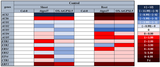 2.5. AtGPXL5 Isoenzyme Affects the Expression of Genes Involved in Ethylene Sensing and Signalling