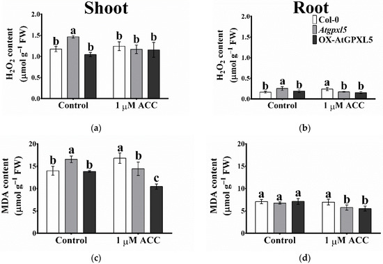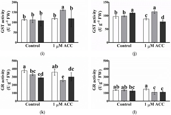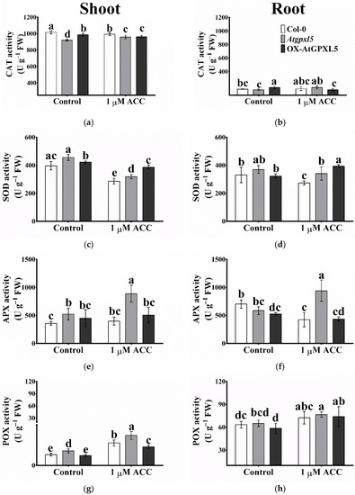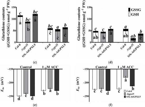 2.9. Atgpxl5 Shoots Had Lower GSH Content and More Oxidised Glutathione Redox Potential Both under Control Conditions and after Application of ACC than Wild Type and OX-AtGPXL5 Plants