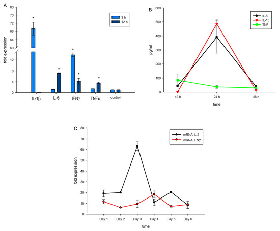 N3 peptide triggers mRNA expression of proinflammatory cytokines TNFα, IL-1β, IL-6 and IFNγ in PBMCs after 3 and 12 h of incubation (A). Secretion of proinflammatory cytokines by PBMCs after 12, 24 and 48 h of incubation with N3 measured using ELISA (B). mRNA expression of IL-2 and IFNγ, quantified using RT-PCR each day after N3 peptide treatment (C). All values were normalized to control (before any treatment). Levels of mRNA were measured by RT-PCR; levels of RPLP/GADPH were used as reference (one-way ANOVA, p-value * < 0.05 vs. control).