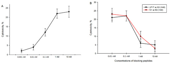 It was mentioned above that N3 stimulates the cytotoxic activity of lymphocytes. We found that maximum cytotoxicity of N3-activated PBMCs is achieved at 1 nM concentration (Figure 4A). We also tested peptides specific to TREM-1 to block transduction signals from the N3 peptide. PBMCs pretreated with various concentrations of LP17 and N1 peptides were incubated with the N3 peptide at a constant concentration of 1nM (Figure 4B). Cytotoxic activity during co-incubation of peptides decreased and was dose-dependent, where IC50 = 0.5 nM for both blocking peptides. Thus, the presence of blocking peptides LP17 and N1 during N3 treatment deteriorates the cytotoxic activity of lymphocytes. In this regard, we assume that N3–TREM-1 interaction is the first and most essential stage in the signal transduction pathway leading to the appearance of cytotoxic lymphocytes.