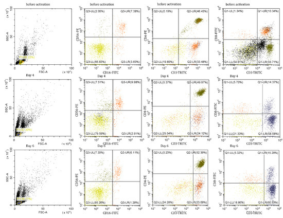 As a next step, we have described cytotoxic subpopulations of PBMCs after N3 treatment. Using flow cytometry, we determined the pattern of CD16 + CD56 + CD3 + CD4 + and CD3 + CD8 + lymphocyte subpopulations, on day zero, day four, and day six of incubation with the N3 peptide (Figure 5).