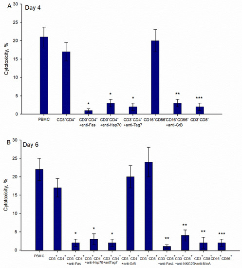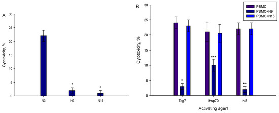 Recombinant Tag7 and Hsp70 were prepared as described in [29]. The Pierce Chromogenic Endotoxin Quant Kit (Thermo Fisher Scientific, Waltham, MA, USA) detected no bacterial LPS in the recombinant protein preparation. sTREM-1 was obtained according to [37]. LP17 (LQVTDSGLYRCVIYHPP, 10−9 mol/L), N9 and N15 were added 1 h before lymphocyte treatment with activating agents. Anti-Hsp70, anti-Tag7 (anti-PGRP-S) (Thermo Fisher Scientific, Waltham, MA, USA), anti-Fas, anti-FasL (Santa Cruz Biotechnology, Santa Cruz, CA, USA), anti-Granzyme B (Abcam, Cambridge, UK) and anti-NKG2D (Santa Cruz Biotechnology, Santa Cruz, CA, USA) were added to cells 30 min before cytotoxic tests were performed.