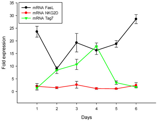 As mentioned above, the recognition of tumor cells by cytotoxic lymphocytes is a necessary stage to induce programmed cell death. This is why our next step was to track processes associated with the appearance of membrane proteins necessary for the recognition and elimination of tumor cells: FasL, Tag7 and NKG2D. We measured the mRNA profile of PBMCs treated with the N3 peptide and demonstrated that, from the first to the sixth days of treatment with the N3 peptide, the mRNA levels of FasL, NKG2D and Tag7 all increased (Figure 7). To summarize, N3 binds to TREM-1, and then dimerization of the receptor leads to signal transduction and appearance of the following cytokines: IL-1β, IL-6, TNFα, IFNγ and IL-2. At the same time, we observed mRNA expression of the proteins (FasL, NKG2D, Tag7) responsible for the induction of programmed cell death. It appears that these processes provide selective conditions for the appearance of the cytotoxic lymphocytes. Thus, the N3 peptide triggers TREM-1 dimerization, which sends an activation signal for the expression of certain cytokines, which in turn leads to a change in the repertoire of lymphocyte membrane proteins to induce programmed cell death.