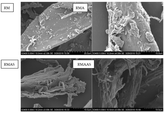 SEM analysis of selected representative samples from different pretreatment conditions. RM: Raw material, no pretreatment. RMA: Raw material + 5% acetic acid. RMAS: Raw material + 5% acetic acid + 4% Na2SO3. RMAAS: Raw material + 5% acetic acid + 4% Na2SO3 + 1% NaOH.