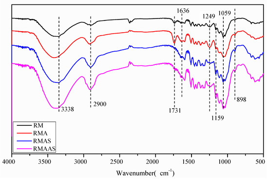 The FT-IR spectra of the Paulownia elongate samples are shown in Figure 2. The absorption peak at 1731 cm−1 represents the ester bond of the hemicellulose acetyl and aldolate groups or the ferulic acid in lignin to the carboxyl group in coumaric acid [39]. The intensity of the absorption peak at 1731 cm−1 in the spectrum of pretreated Paulownia was significantly reduced, and the order of peak intensity was non-treated Paulownia > acetic acid pretreated Paulownia > Na2SO3 pretreated Paulownia > alkaline sulfite pretreated Paulownia. This indicated that the lignin carbonyl was degraded by the pretreatment and caused lignin dissolution. The decreased absorption indicated greater damage to the lignin structure, which made cellulose more accessible to cellulase [40]. Different degrees of structural fragmentation reduced the recalcitrant properties of Paulownia samples and enhanced enzymatic hydrolysis. Alkaline sodium sulfite pretreatment showed a greater ability to destroy these structures. The characteristic peak of lignin was located at 1249 cm−1 (C-O guaiac ring), and the peak strength of lignin in non-treated samples was significantly higher than that in pretreated samples. This may be due to a decreased lignin content. Compared with the non-treated samples, the pretreated samples had an increased peak intensity (characteristic peak of β-D glycosidic bond) at 898 cm−1 and 1159 cm−1, and the reverse order of peak intensity was non-treated Paulownia < acetic acid pretreated Paulownia < Na2SO3 pretreated Paulownia < alkaline sulfite pretreated Paulownia. This may be due to a higher content of polysaccharides (cellulose and xylan) after pretreatment [41].