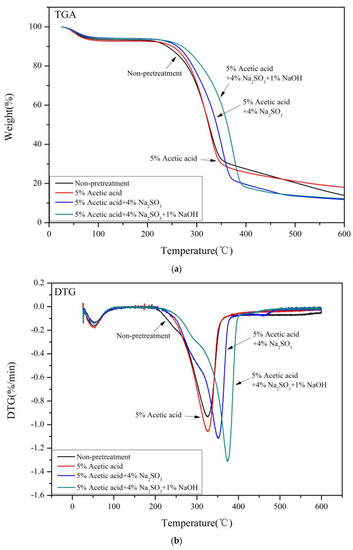 Figure 3b shows the first differential curve (DTG) of the thermogravimetric curve. Most sample degradation occurred between 200 °C and 400 °C. The degradation temperature of hemicelluloses was 323 °C, while the degradation temperature of pure cellulose was 356 °C. The thermal degradation of lignin occurred slowly and over a wide temperature range, so the degradation was difficult to confirm. The DTG curves of the non-treated samples showed a broad peak at 200–400 °C. The maximum peaks of the pretreated samples shifted to higher temperatures compared with the non-treated samples. The maximum thermal degradation temperatures of cellulose in the samples pretreated with acetic acid, Na2SO3, and Na2SO3–NaOH were 326 °C, 352 °C, and 374 °C, respectively. The non-treated samples degraded at 324 °C, possibly due to their higher ash content, which may act as a catalyst during pyrolysis to accelerate the degradation of cellulose [43]. The maximum degradation rates of cellulose in all pretreated samples increased, possibly due to the higher cellulose crystallinity of the samples after pretreatment [44].