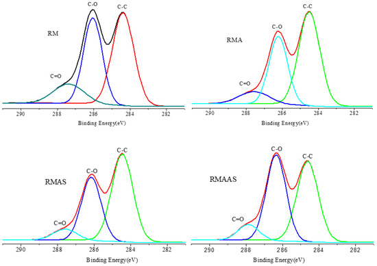 The concentration of functional groups was analyzed based on the carbon content after different pretreatment conditions (Figure 5). The high-resolution carbon peaks were divided into four categories: C-C/C-H (C1), C-O (C2), C=O (C3), and COOH (C4) [35]. In the samples, only C1, C2, and C3 peaks were observed, which was similar to the C1 of corn stalk. The C1 peak was mainly composed of lignin and extractives. Compared with the non-treated samples, the C1 content in the samples treated with acetic acid was higher, probably due to the removal of xylan, which increased the lignin content on the surface. The C1 content was only slightly lower after sodium sulfite pretreatment, indicating that the surface layer was still covered with lignin, and some of the extractives may have been removed. These results were similar to those of previous studies.