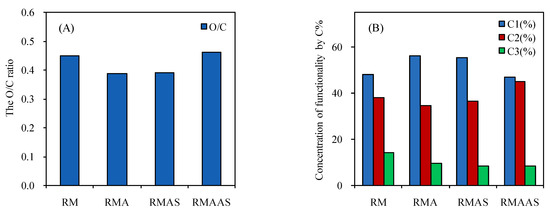 The O/C ratio (A) and concentration of functionality by percentage carbon (B) in the samples after different pretreatments. No pretreatment (RM); 5% acetic acid (RMA); 5% acetic acid + 4% Na2SO3 (RMAS); 5% acetic acid + 4% Na2SO3 + 1% NaOH (RMAAS). C-C/C-H(C1); (C-O)C2; (C=O)C3.