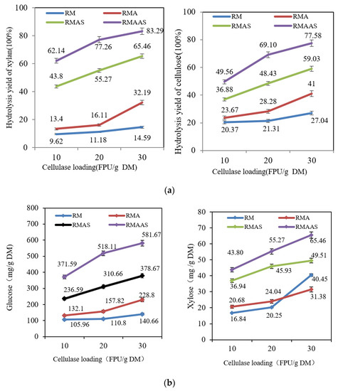 (a) Hydrolysis yields (%) of samples subjected to different pretreatment methods according to cellulase dosage. Cellic®CTec2 (10, 20, 30 FPU/g DM) at 50 °C and pH 5.0 for 72 h. (b) Hydrolysis yields (mg/g DM) in samples subjected to different pretreatment methods according to cellulase dosage. Cellic®CTec2 (10, 20, 30 FPU/g DM) at 50 °C and pH 5.0 for 72 h. RM: Raw material, no pretreatment. RMA: Raw material + 5% acetic acid. RMAS: Raw material + 5% acetic acid + 4% Na2SO3. RMAAS: Raw material + 5% acetic acid + 4% Na2SO3 + 1%NaOH.