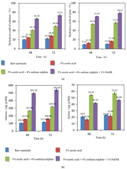 Compared with the non-treated material, the yields were significantly improved after synergistic Na2SO3–NaOH treatment. When the hydrolysis time was 48 h, the yields of glucose and xylose were 66% and 71%, respectively. After prolonging the hydrolysis time to 72 h, the yields of glucose and xylose increased to 74% and 79%.