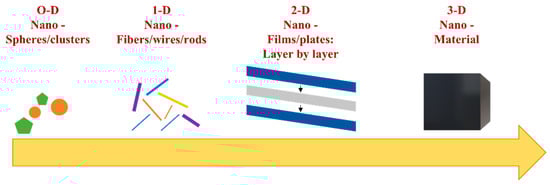 Materials at the nanoscale level are found in a variety of forms depending on their aspect and structure. Over time, many criteria were considered for describing nanomaterials. Origin, form, or dimensional characteristics have led to a variety of classification criteria for nanomaterials. In literature studies, the most important criterion is based on dimensional properties [2,5]. In biomedical applications, dimension is an essential factor because the interaction of materials with biological structures inside the human body strongly depends on it. In this regard, the nanomaterials can be classified in 0-D, 1-D, 2-D and 3-D dimensions, depending on the architecture and on the external sides of the material, as can be observed in Figure 1 [2,5,6].