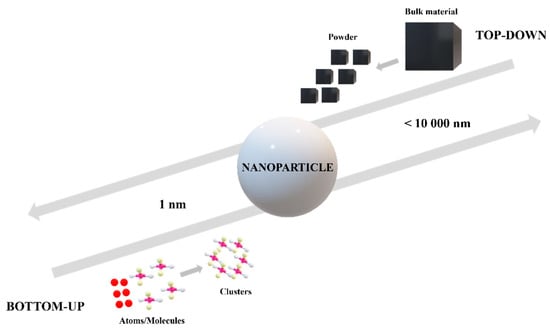 Nanoparticles can be synthesized through different approaches. In general, there are two directions: “top-down” and “bottom-up” methods. Depending on the precursors and materials used, the two approaches are based on different technologies. The “top to bottom” method is based on a bulk material transformation into small particles, while the “bottom to top” method involves the production of nanoparticles using chemical reagents able to assemble atoms to “seed” nuclei which will grow further into clusters and particles of nanometric dimensions, as can be observed in Figure 2 [10,11,12]. Organic particles are usually obtained through bottom-up methods such as chemical reduction, sol-gel, emulsification, or self-assembly processes. These methods lead, in most cases, to nanoparticle fabrication in a spherical form and in a polydisperse size distribution due to the inherent surface tension that makes itself manifest. Besides organic particles, inorganic nanoparticles in different shapes can be obtained through bottom-up techniques, as well, for example, by a nucleation process [13].